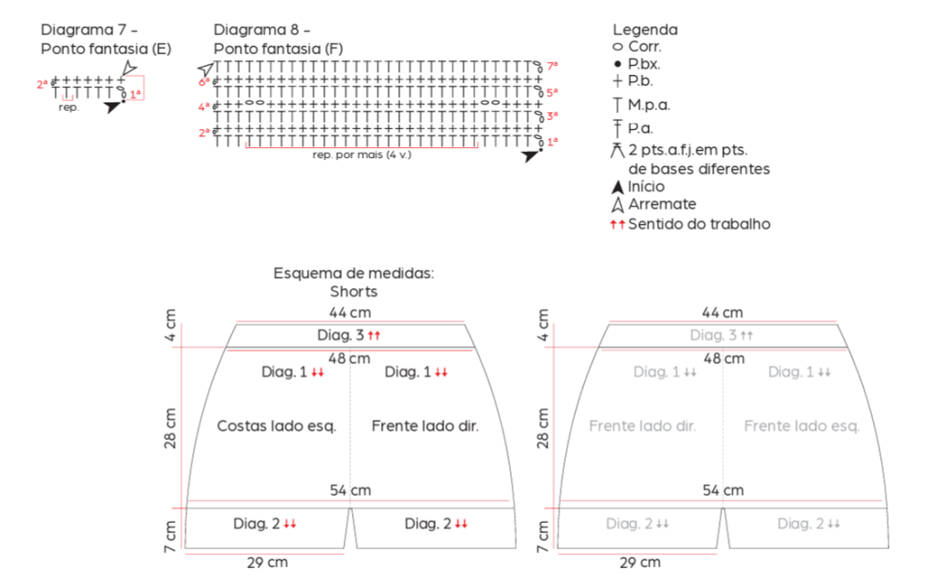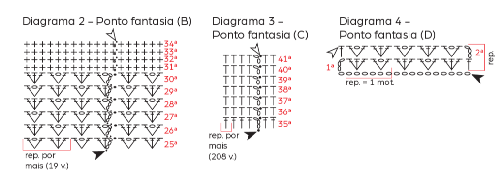 acomp.: acompanhando • ag.: agulha • aum.: aumente • carr.: carreira • diag.: diagrama • dir.: direito ou direita • esq.: esquerdo ou esquerda • p.: ponto • pts.: pontos • mot.: motivo ou motivos • nov.: novelos • rem.: rematar • rep.: repetição • trab.: trabalhe ou trabalhando • v.: vezes • Corr.: correntinha • P.bx.: ponto baixíssimo • P.b.: ponto baixo • M.p.a.: meio ponto alto • P.a.: ponto alto • 2 pts.a.f.j.: 2 pontos altos fechados juntos (em pts. de bases diferentes) • Ponto fantasia (A): diag. 1 • (B): diag. 2 • (C): diag. 3 • (D): diags. 4, 5 (decote lado dir.) e 6 (decote lado esq.) • (E): diag. 7 • (F): diag. 8 • Amostra: 10 cm no p. fantasia (A – diag. 1), ag. 2,5 mm = 28 pts x 12 carr.