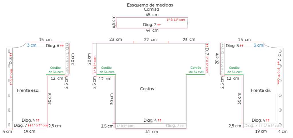 Execução: Transfira os moldes para o papel vegetal para usar como referência na execução da peça. Observe as setas no esquema de medidas com a indicação do sentido do trabalho.