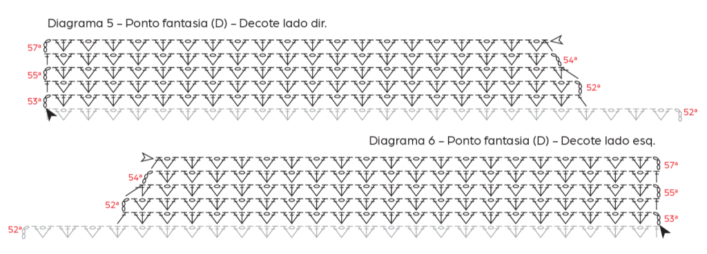 Frente dir.: Use a ag. de crochê de 2,5 mm e o fio Cléa Duplo branco. Inicie a peça pela parte inferior com um cordão de 53 corr., sobre este cordão trab. em carr. de ida e volta no p. fantasia (D = 8 mot. + 5 pts.) acomp. o diag. 4 e os pts. de rep. da 1ª à 33ª carr.. Para dar início a manga do lado esq. da peça trab. um cordão de 34 corr., prossiga com a parte da manga também no p. no p. fantasia (D = 5 mot. + 4 pts.) acomp. o diag. 4 e os pts. de rep. da 34ª à 57ª carr.. A partir da 53ª carr. prossiga no p. fantasia (D) acomp. a execução do decote do diag. 5. Na 36ª, 37ª, 38ª, 39ª, 40ª, 41ª, 42ª, 44ª, 45ª, 46ª, 48ª 49ª, 50ª, 52ª, 53ª, 54ª, 56ª e 57ª carr.: use o fio Cléa Duplo na cor Anil profundo, nas demais carr. use o fio Cléa Duplo Branco. Rem. o fio e reserve a peça.