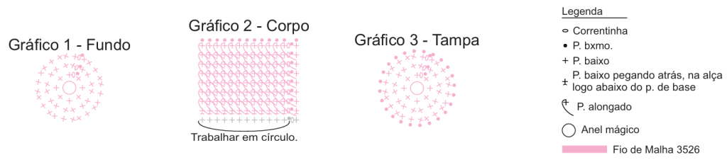 Tampa: Faça um anel mágico e siga o gráfico 3, trabalhando no redondo perfeito. Dará um total de 3 carr.: