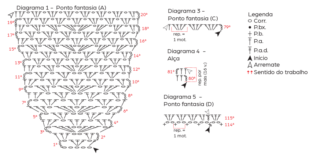 acomp.: acompanhando • ag.: agulha • carr.: carreira • diag.: diagrama • dir.: direita • esq.: esquerda • p.: ponto • pts.: pontos • mot.: motivo(s) • nov.: novelos • rem.: rematar • rep.: repetição • trab.: trabalhe/trabalhado • v.: vezes • Corr.: correntinha • P.bx.: ponto baixíssimo • P.b.: ponto baixo • P.a.: ponto alto • P.a.d.: ponto alto duplo • Ponto fantasia (A): siga o diag. 1 • Ponto fantasia (B): siga o diag. 2 • Ponto fantasia (C): siga o diag. 3 • Alça: siga o diag. 4 • Ponto fantasia (D): siga o diag. 5.