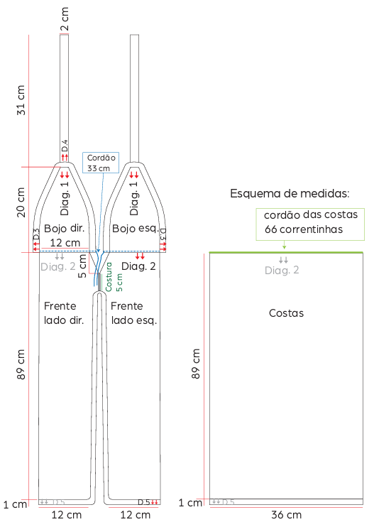 Transfira os moldes para o papel vegetal para usar como referência na execução da peça. Observe as setas no esquema de medidas com a indicação do sentido do trabalho. OBS.: Toda a peça foi executada usando fio Queen duplo.
