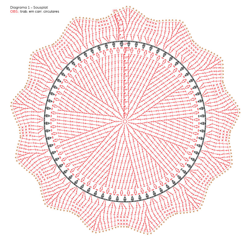 13ª carr.: Emende o fio Barroco Maxcolor na cor Vermelho-Círculo com agulha 3,5 mm. 3 corr., 2 p.a. no mesmo espaço de base, pule 1 p. de base, 3 p.a. no mesmo espaço de base, *pule 1 p. de base, 2 p.a. no mesmo espaço, pule 1 p. de base, 3 p.a. no mesmo espaço*, repita até o final. Feche com p.b.x. e continue acompanhando o diagrama 1, realizando as trocas de cores. Remate. Faça 4 peças iguais.