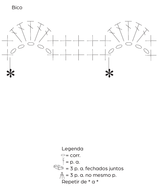Na lateral direita, faça o bico seguindo o gráfico, repetindo de * a * no sentido dos pontos (4 v.) mais as bordas.