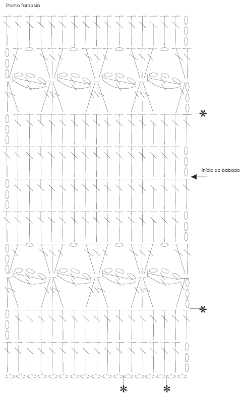 Na lateral direita, faça o bico seguindo o gráfico, repetindo de * a * no sentido dos pontos (4 v.) mais as bordas.