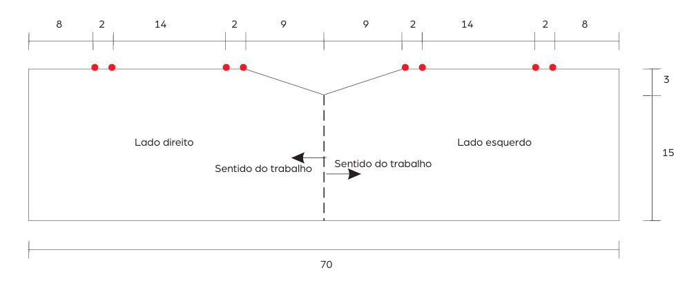 Frente e costas – São trabalhadas juntas, na horizontal. Comece pelo centro da peça, linha pontilhada no molde.