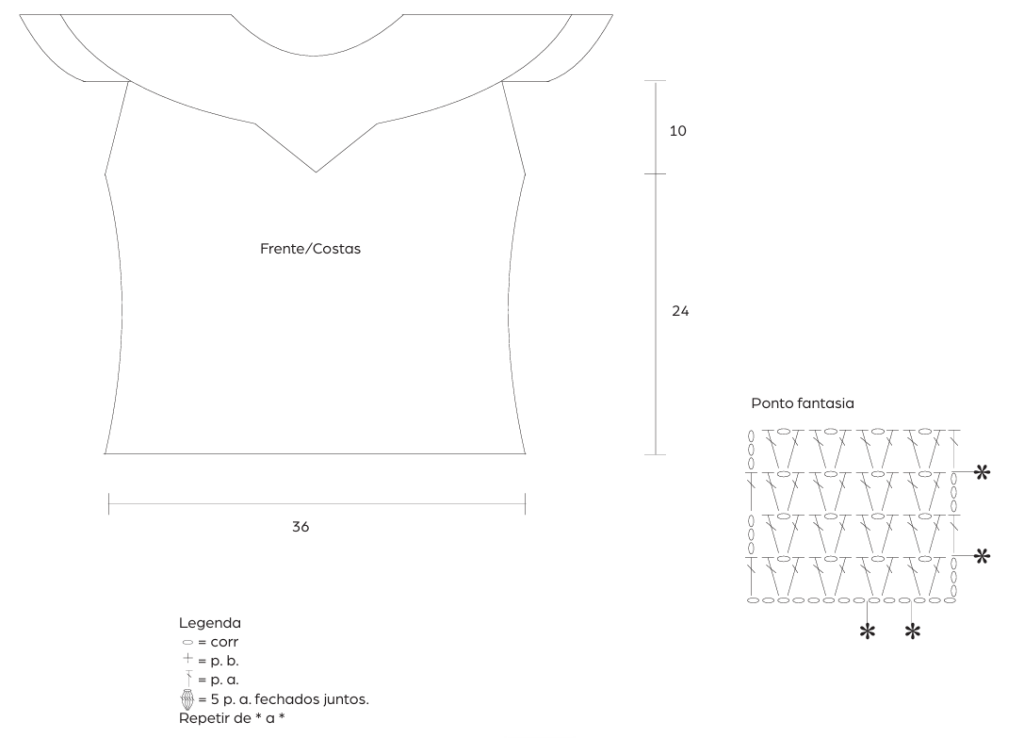 Mangas – Trabalhe as mangas diretamente na peça. Com a ag. nº 2,0 mm e fio Queen Duplo cor Paçoca, trabalhe em p. fantasia seguindo o gráfico, em 2 v centrais, repita de * a * do gráfico no sentido das carr. (6 v.). Aum. de cada lado em cada carr. 1 vez de * a * (5 v.). Faça a união da manga com 1 p. bx. no final de cada carr. Terminado os aum., rem. Faça as duas mangas iguais. :contentReference[oaicite:4]{index=4}