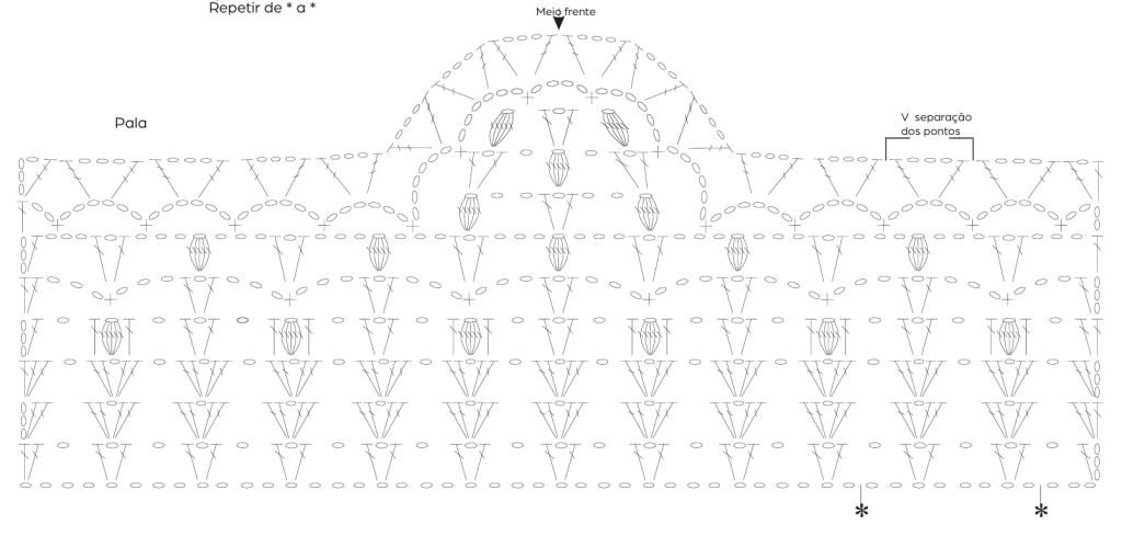 Frente e Costas – São começadas juntas. Com a ag. nº 2,0 mm e fio Queen Duplo cor Paçoca, faça uma corr. de 152 p., feche em círculo e trabalhe a pala seguindo o gráfico, repita de * a * no sentido das carr. (19 v.). Feche todas as carr. em círculo com 1 p. bx. e inicie a próxima carr. com corr. Faça a 7ª carr., faça as 3 carr. seguintes, somente de um dos lados no centro da pala (frente). Terminada as 3 carr., continue o restante do gráfico em círculo a toda a volta da pala seguindo o gráfico. Terminada o gráfico da pala, separe os p. para as mangas, frente e costas. Centralize os p. para a frente pela indicação no gráfico, ver indicação no gráfico da pala para a separação dos p. do seguinte modo: 6 v para uma manga, 16 v para a frente, 6 v para a outra manga e 15 v para as costas. :contentReference[oaicite:1]{index=1}