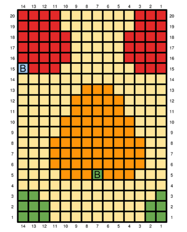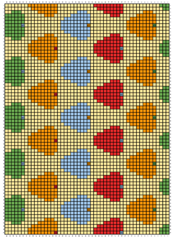 Na vertical, a bolsa terá cinco cajus, sendo o último sem as últimas 3 carreiras. O gráfico maior mostra um dos lados da bolsa e deve ser lido da direita para a esquerda. Cada quadrado do gráfico corresponde a um ponto baixo, com a respectiva cor do fio. O quadrado com a letra “B” corresponde ao ponto bolha feito passando a agulha na carreira de baixo.
