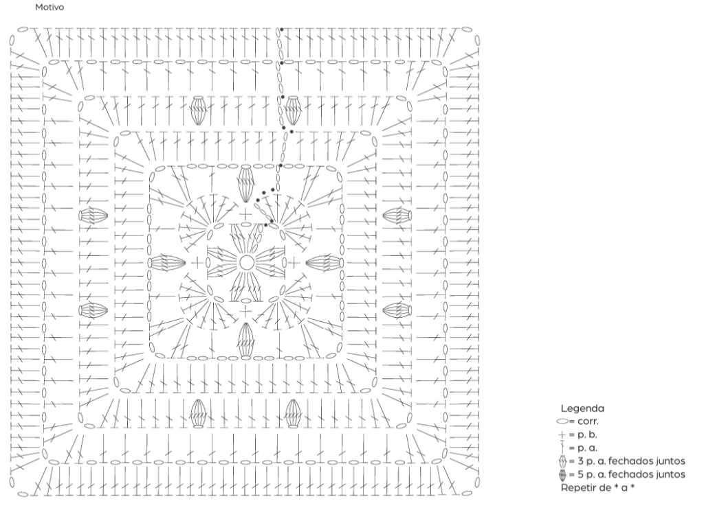 Pontos utilizados: correntinha (corr.); ponto baixíssimo (p. bx.); ponto baixo (p. b.); ponto alto (p. a.); motivo e meio motivo (conforme gráficos).