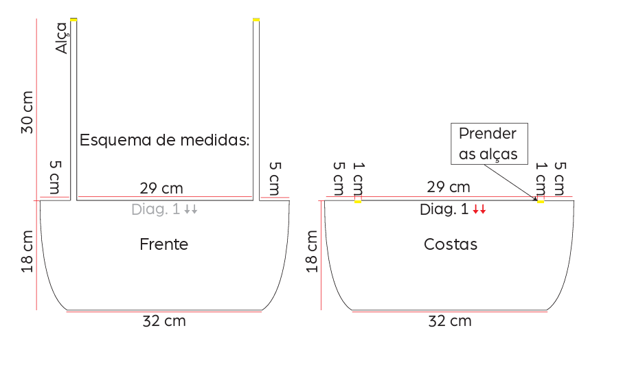 Alça: Use a ag. de crochê de 3,0 mm e o fio Charme na cor 7625 (Castanha). À 5 cm de distância das laterais da parte superior da peça trab. um cordão de 30 cm em corr.. Sobre os dois lados desse cordão trab. uma carr. de p.b.. Rem. o fio com aprox. 20 cm. Transpasse este fio na ag. de tapeçaria e prenda a alça da parte das costas com pts. de alinhavo. Prenda as alças nas indicações em amarelo no esquema de medidas.