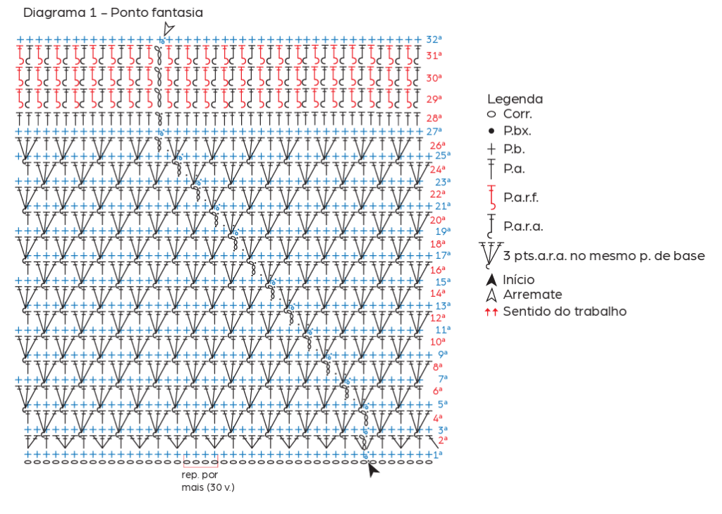 acomp.: acompanhando, ag.: agulha, aprox.: aproximadamente, carr.: carreira, diag.: diagrama, p.: ponto, nov.: novelo, novelos, rem.: rematar, rep.: repita, repetição, trab.: trabalhe ou trabalhando, v.: vezes, corr.: correntinha, P.bx.: ponto baixíssimo, P.b.: ponto baixo, P.a.: ponto alto, P.a.r.f.: p. alto em relevo pegando pela frente do p. da carr. anterior, P.a.r.a.: p. alto em relevo pegando por trás do p. da carr. anterior, 3 Pts.a.r.a. no mesmo p. de base: 3 pontos altos em relevo pegando por trás do p. da carr. anterior no mesmo ponto de base, Ponto fantasia: siga o diag. 1.