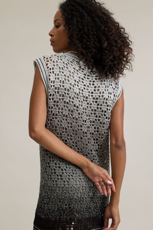 Execução: Frente e costas – São começadas juntas até a cava. A peça é toda trabalhada com 4 fios juntos. Com a ag. nº 4,0mm e 4 fios juntos Cordonê cor Preto, faça uma corr. de 180 p. feche em círculo com 1 p. bx. e trabalhe em p. fantasia seguindo o gráfico. Feche todas as carr. com 1 p. bx. e inicie a próxima carr. com 3 corr.. Continue o trabalho com 4 fios juntos na seguinte ordem de cores: 4 carr. com o fio Cordonê cor Preto, 4 carr. com o fio Cordonê 3 fios cor preto e 1 fio cor Anoitecer, 4 carr. com Cordonê 2 fios cor preto e 2 fios cor Anoitecer, 4 carr. com Cordonê 3 fios cor Anoitecer 1 fio Preto, 4 carr. com Cordonê 4 fios cor Anoitecer, 4 carr. com Cordonê 3 fios anoitecer 1 fio Cocar, 4 carr. com Cordonê 2 fios cor anoitecer 2 fios Cocar, 4 carr. com Cordonê 1 fio cor anoitecer e 3 fio cor cocar, 4 carr. com Cordonê cor Cocar, 4 carr. com Cordonê 3 fios Cocar 1 fios cor radiante, 4 carr. com Cordonê 2 fios Cocar 2 fio Prata Radiante, 4 carr. com Cordonê 1 fio Cocar 3 fios cor Prata Radiante, 12 carr. com Cordonê 4 fios cor Prata Radiante. Ao mesmo tempo a 48 cm do início, divida o trabalho em duas partes iguais (frente/Costas).
