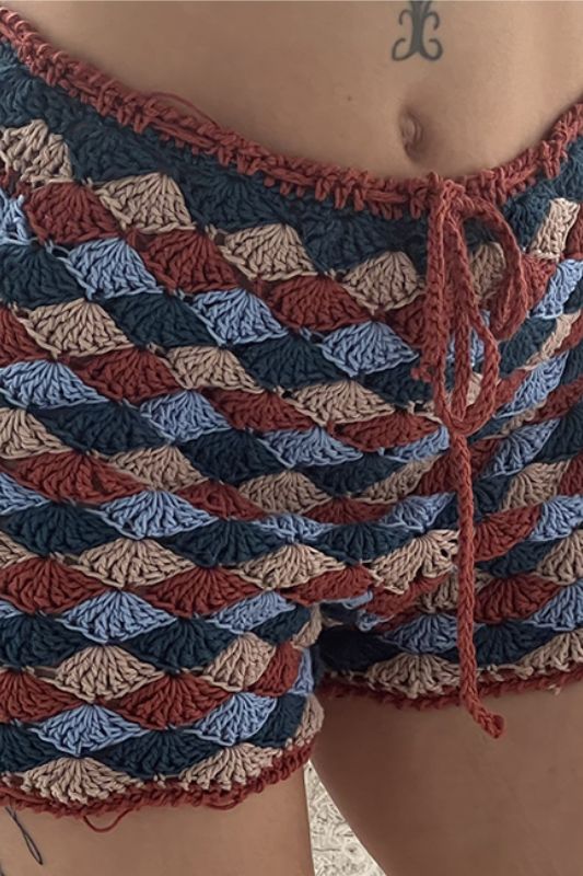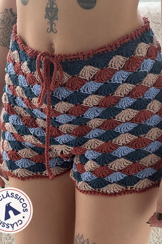 Após finalizar, una as duas partes com costuras laterais em ambos os lados, feita com agulha de tapeçaria. Faça duas carreiras em cada “perna” do shorts, seguindo o mesmo padrão do restante da peça. Se quiser uma bermuda mais comprida, faça mais carreiras em cada lado.