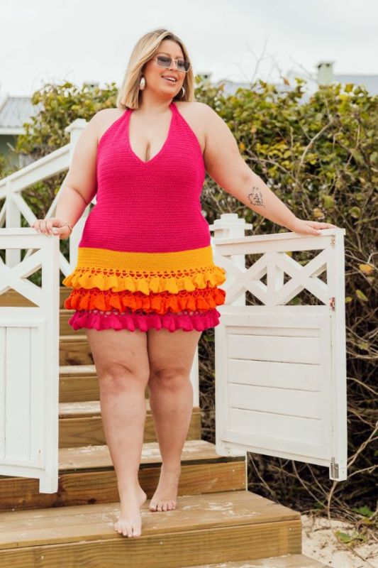 Vestido: Use a ag. de crochê de 3,0 mm e o fio Charme na cor Tutti-Frutti. Inicie a peça pelo quadril. Trab. frente e costas de uma só vez iniciando pela parte central das costas em carr. circulares. Trab. um cordão de 224 corr., 1 p.bx. para fechar o arco. Sobre este arco trab. no p. fantasia (A) acomp. o diag. 1 e os pts. de rep. da 1ª à 15ª carr.. Da 1ª à 8ª carr. trab. 224 pts.; 9ª e 10ª carr. trab. 220 pts.; Da 12ª à 14ª carr. trab. 183 pts.; 15ª carr. trab. 167 pts.. Na carr. seg. prossiga a peça em carr. de ida e volta no p. fantasia (B) acomp. o diag. 2 e os pts. de rep. da 1ª à 88ª carr.. Da 1ª à 41ª (parte superior da peça) da 42ª à 88ª (alça). Rem. o fio. Babados sobrepostos: Babado (Canário): Use a ag. de crochê de 3,0 mm e o fio Charme na cor Canário, unir o fio no cordão inicial do quadril. Trab. o babado no p. fantasia no p. fantasia (C) acomp. o diag. 3 e o p. de rep. da 1ª à 18ª carr.. Trab. em carr. circulares. Rem. o fio e reserve a peça. Babado (Laranja): Use a ag. de crochê de 3,0 mm e o fio Charme na cor Laranja. Trab. um cordão de 224 corr., 1 p.bx. para fechar o arco. Sobre este arco trab. no p. fantasia (C) acomp. o diag. 3 e o p. de rep. da 1ª à 18ª carr.. Trab. em carr. circulares. Rem o fio e reserve a peça. Babado (Tutti-Frutti): Igual ao babado laranja. Finalização dos babados: Use a ag. de tapeçaria e o fio Charme na cor Canário. Costure o babado laranja pelo avesso do babado Canário em pts. de alinhavo prendendo sobre a 12ª carr. do babado (Canário). Mude para o fio Charme na cor Laranja. Costure o babado Tutti-Frutti pelo avesso do babado Laranja em pts. de alinhavo prendendo sobre a 12ª carr. do babado (Laranja). Bico de acabamento: Use a ag. de crochê de 3,0 mm e o fio Charme na cor Tutti-Frutti. Trab. ao redor da peça em carr. circular em p.b.. Distribuir os pts. da seg. maneira: 47 pts. de cada lado do decote parte da frente, 77 pts. de cada lado do decote parte das costas, 60 pts. em cada lado da alça e 4 pts. na parte superior da alça. Sugestão do forro: Corte o tecido para o forro na modelagem do vestido. Use o fio Maxxi retrós na cor Pink na máquina de costura. Prenda o forro ao redor do decote da parte da frente e no decote da parte das costas.