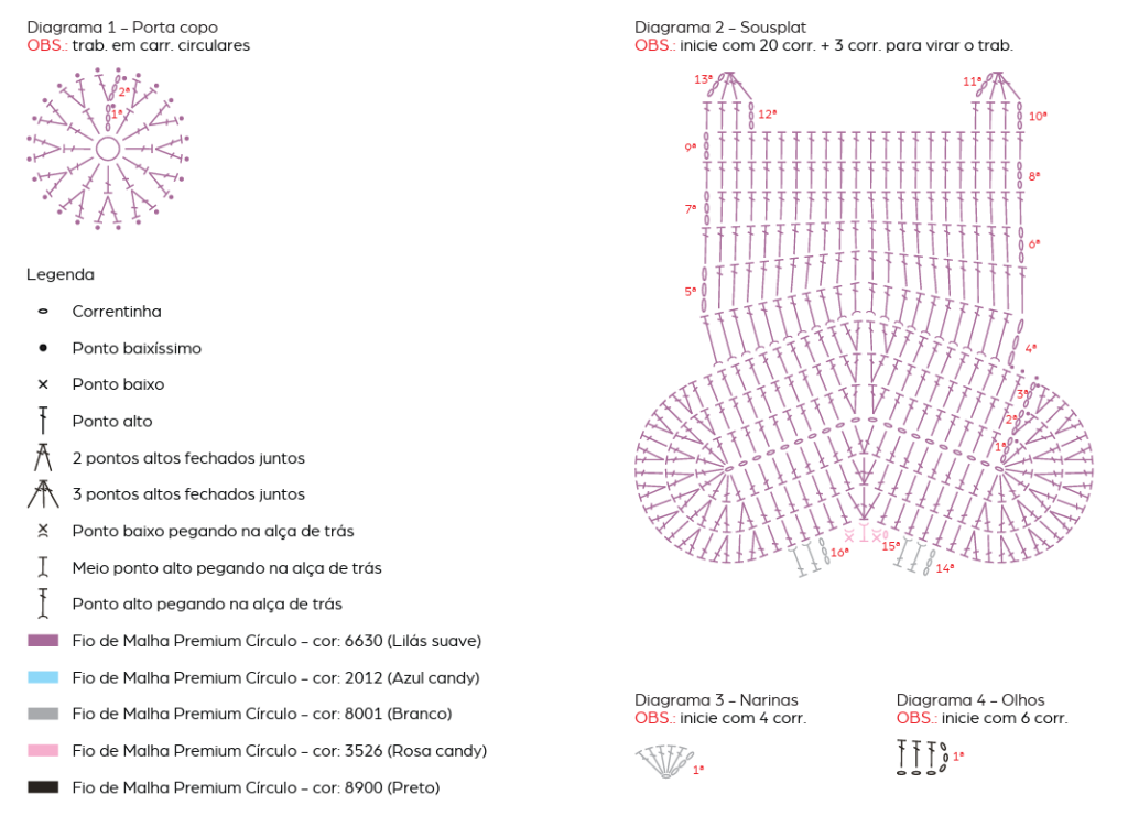 acomp.: acompanhando ou acompanhe • ag.: agulha • carr.: carreira • cont.: continuidade ou continue • diag.: diagrama ou diagramas • nov.: novelos • p.: ponto • pts.: pontos • rep.: repetir ou repetições • rem.: rematar • trab.: trabalhe ou trabalhando • v.: vez ou vezes • acab.: acabamento • corr.: correntinha • p.b.x.: ponto baixíssimo • p.b.: ponto baixo • p.a.: ponto alto • p.a.f.j.: pontos altos fechados juntos • p.b.t.: ponto baixo pegando na alça de trás • m.p.a.a.t.: meio ponto alto pegando na alça de trás • p.a.a.t.: ponto alto pegando na alça de trás • aum. de p.a.: aumento de 2 pontos altos no mesmo ponto de base
