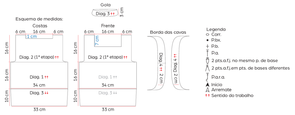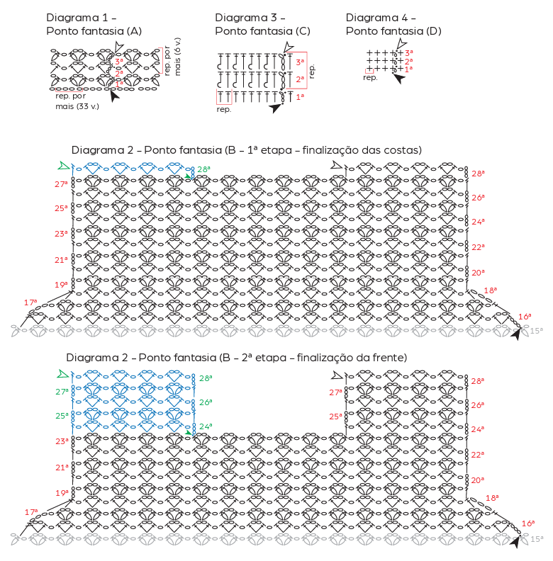 Corr.: correntinha, P.bx.: ponto baixíssimo, P.b.: ponto baixo, P.a.: ponto alto, 2 pts.a.f.j. no mesmo p. de base: 2 pontos altos fechados juntos no mesmo ponto de base, 2 pts.a.f.j. em pts. de bases diferentes: 2 pontos altos fechados juntos em pontos de bases diferentes, P.a.r.a.: p. alto em relevo pegando por trás do p. da carr. anterior, P. fantasia (A): siga o diag. 1, P. fantasia (B – 1ª e 2ª etapas): siga o diag. 2, P. fantasia (C): siga o diag. 3, P. fantasia (D): siga o diag. 4.