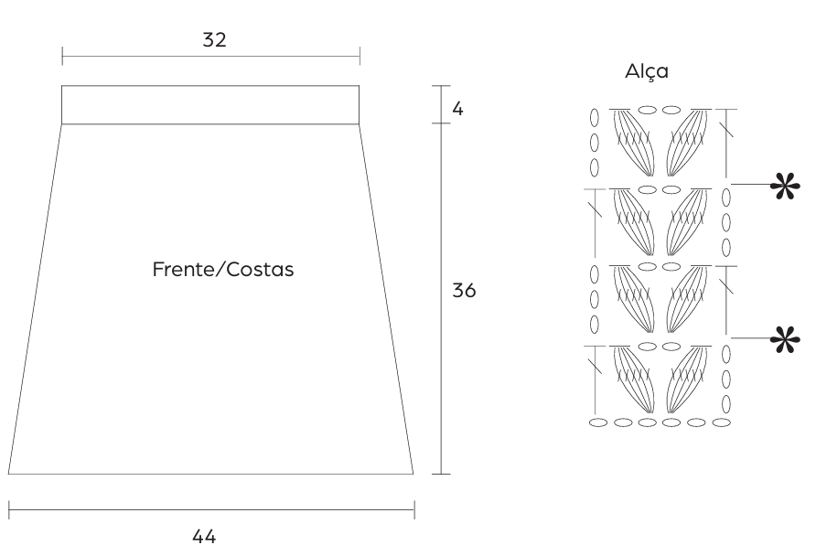 Alça – Com a ag. nº 4,5 mm e fio Lolita cor Amoreira, faça uma corr. de 6 p. mais 3 corr. para virar e trabalhe a alça seguindo o gráfico. A 52 cm do início do trabalho, rem.