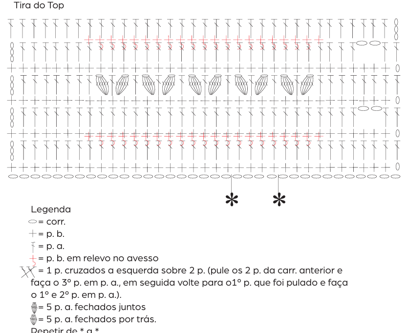 Tira do top – Com a ag. nº 4,5 mm e fio Lolita cor Amoreira, faça de cada lado dos bojos uma corr. de 30 p. mais 1 corr. para virar e trabalhe a tira do top seguindo o gráfico. Distribua os p. do seguinte modo: 8 p. do início do gráfico, repita de * a * 23 v. e 8 p. do final do gráfico. Terminado o gráfico, rem.