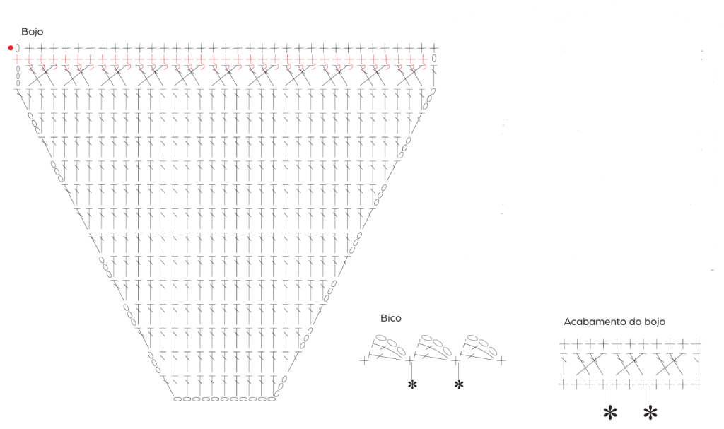 Ponto Fantasia – saia: siga o gráfico. Tira do top: siga o gráfico. Bojo: siga o gráfico. Alça: siga o gráfico. Bico: siga o gráfico.