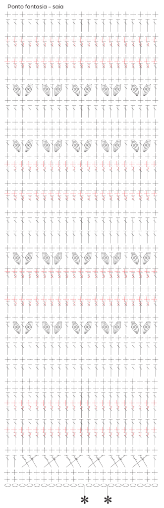 Saia – Transfira o molde para o papel vegetal para usar como referência na execução da peça. Comece pelo cós. Com a ag. nº 4,5 mm e fio Lolita cor Amoreira, faça uma corr. de 8 p. mais 1 corr. para virar e trabalhe, em p. b. A 64 cm do início, trabalhe em um dos lados maiores em carr. de ida e volta e em p. fantasia da saia seguindo o gráfico, repita de * a * no sentido dos p. (44 v.). A 7 cm trabalhados em p. fantasia, feche em círculo com um p. bx.. Continue em círculo e em p. fantasia seguindo o gráfico da saia. Feche todas as carr. com 1 p. bx. e inicie a próxima carr. com corr. Terminado o gráfico, faça a toda volta uma carr. do bico seguindo o gráfico e rem.