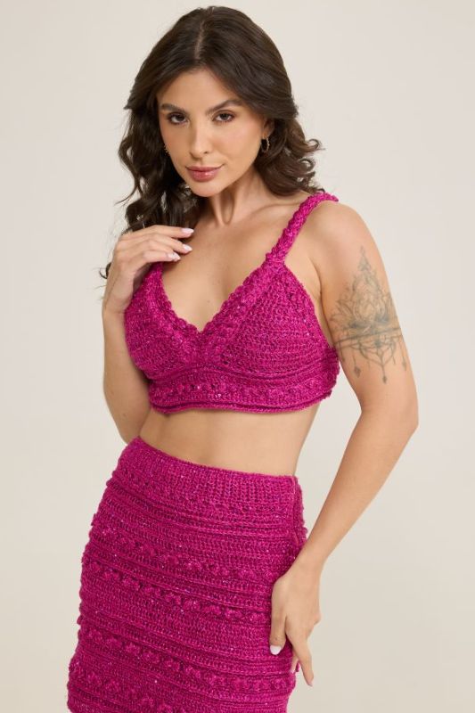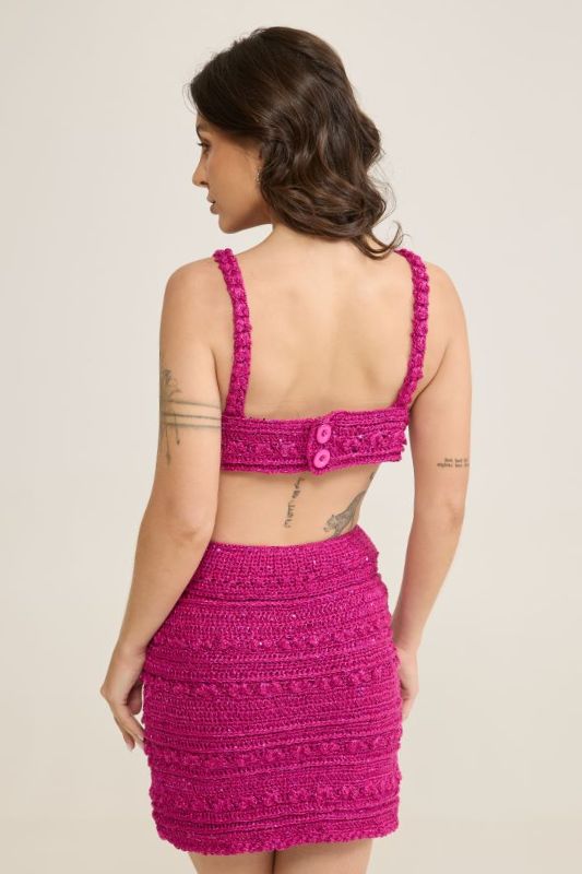 Top – Com a ag. nº 4,5 mm e fio Lolita cor Amoreira, faça a toda volta do top uma carr. em p. b. e rem. Com a ag. nº 4,5 mm e fio Lolita cor Amoreira, faça dos dois lados do decote uma carr. do bico seguindo o gráfico e rem. Costure uma ponta de uma alça na tira do top a 8 cm do bojo. Costure a outra ponta dessa mesma tira na 1ª carr. da tira junto à união dos bojos. Costure as laterais da alça no bojo para dar acabamento no top. Pregue os botões na ponta da tira.