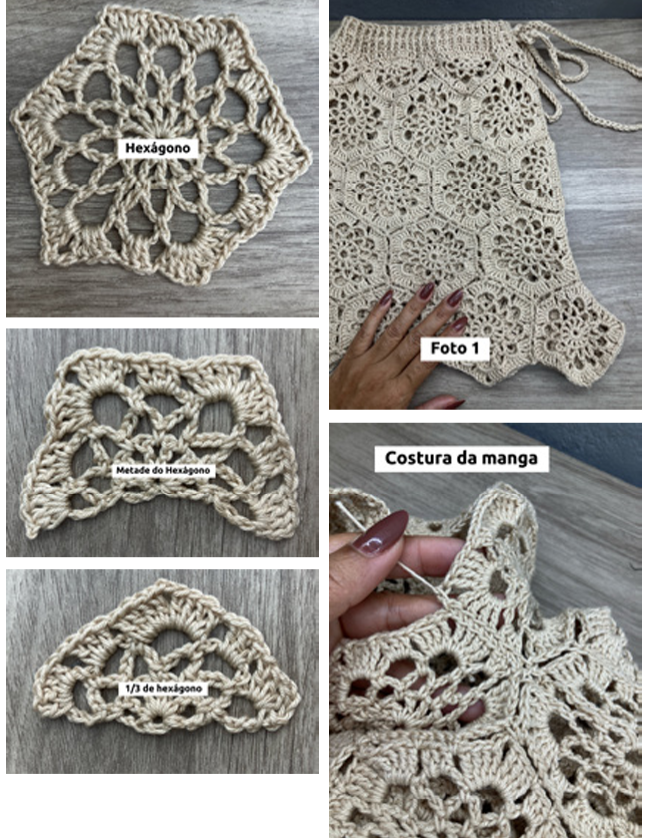Faça 5 hexágonos para a cava, sendo o primeiro e o último costurados pela metade.