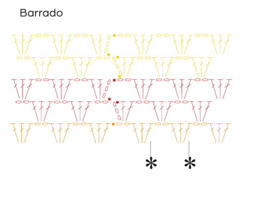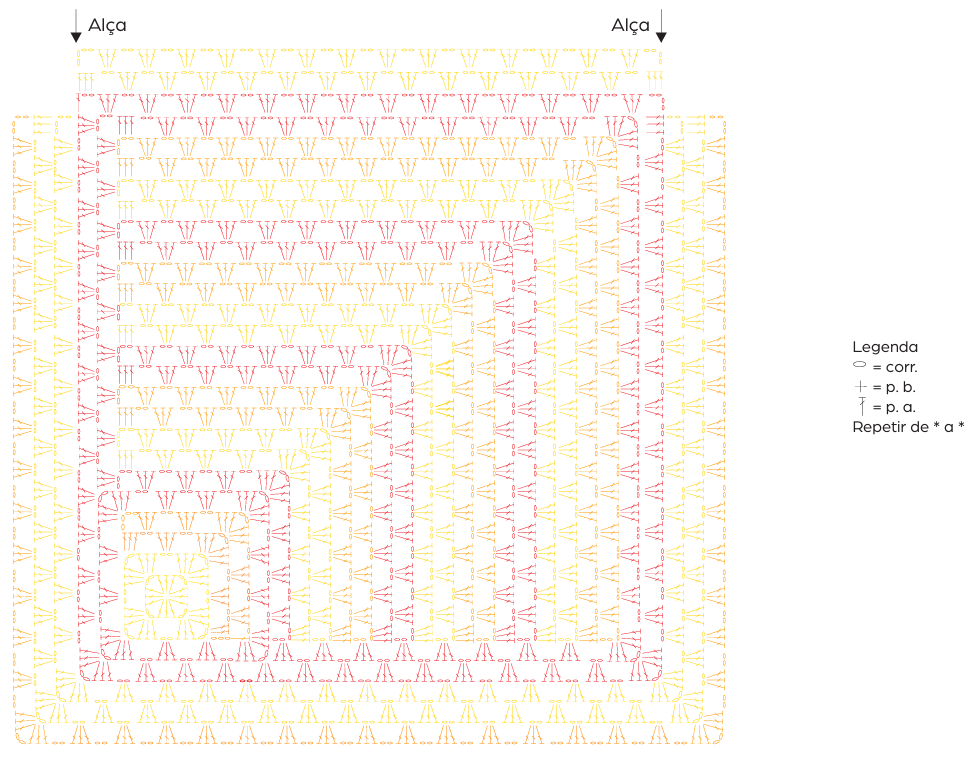 Pontos utilizados e abreviaturas: As indicações entre ( ) são as abreviaturas usadas na receita. Agulha (ag.), Correntinha (corr.), Ponto (p.), Laçada (laç.), Carreira (carr.), Remate (rem.), Diminuição (dim.), Aumento (aum.), Novelo (nov.), Vezes (v.). Ponto alto (p. a.). Ponto baixíssimo (p. bx.): introduza a ag., laç., puxe o p. e passe diretamente no p. da ag.. Ponto baixo (p. b.): introduza a ag., laç., puxe o p. e com outra laç., rem. todos os p.. Ponto alto (p. a.): laç., introduza a ag., laç., puxe o p. laç., rem., 2 p. e com outra laç., rem. todos os p.. Frente/Costas – siga o gráfico. Barrado – siga o gráfico.
