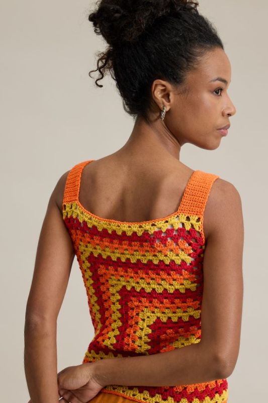 Acabamento – Costure os lados. Prenda o fio Verão cor Tangerina e com a ag. nº 3,0mm, faça a toda volta da borda inferior o barrado seguindo o gráfico. Trabalhe mudando a cor a cada 2 carr. conforme gráfico. Terminado o gráfico faça a toda volta uma carr. em p. b. com o fio Verão cor Tangerina e rem.. Com a ag. nº 3,0mm e o fio Verão cor Tangerina, faça as alças em p. b.. Prenda o fio na frente, no início do trabalho indicado com a seta e trabalhe 10 p. durante 20 cm, nesta altura prenda a alça nas costas na mesma direção da frente. Faça uma alça de cada lado. Com a ag. nº 3,0mm e o fio Verão cor Tangerina, faça no decote frente, costas e cavas uma carr. em p. b. e rem..