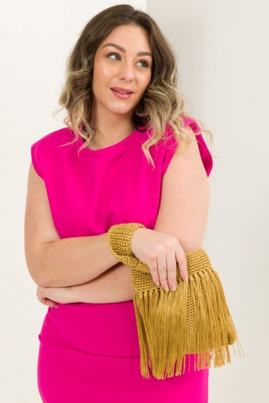 Acabamento – Costure a ponta solta da alça do outro lado da bolsa. Ficam 14 cm entre as alças nas laterais. Faça com o fio Encanto cor Ouro, a toda a volta da bolsa à 4,5 cm da abertura da bolsa, franja em crochê seguindo a receita. Faça cada franja com 6 fios juntos e com 22 cm de comprimento cada fio. Faça uma franja a cada 2 p..