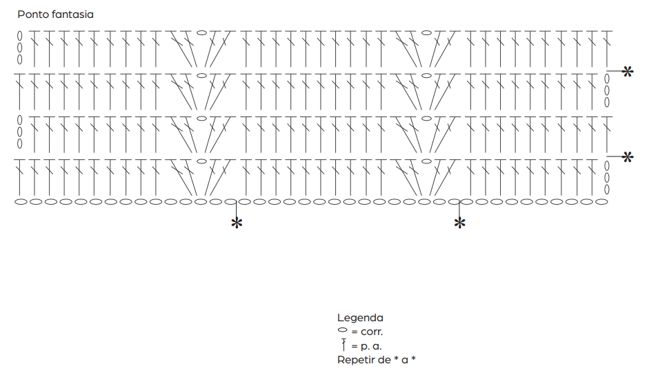 ag.: agulha • corr.: correntinha • p.: ponto • laç.: laçada • nov.: novelo • v.: vezes • carr.: carreira • rem.: remate • dim.: diminuição • aum.: aumento • p. a. duplo: ponto alto duplo • p. bx.: ponto baixíssimo • p. b.: ponto baixo • p. a.: ponto alto