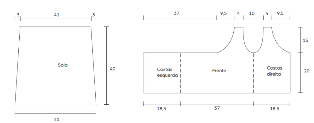 Com o fio Fitonê cor Choque, e a agulha nº 5,0mm, faça a toda volta do início da saia uma carr. em p. b. e rem.